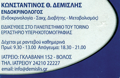 Ο Ιατρός Ενδοκρινολόγος Κωνσταντίνος Δεμισλής, γεννήθηκε στην πόλη του Βόλου όπου και αποπεράτωσε τις βασικές του σπουδές. Κατά το ακαδημαϊκό έτος 78-79 έκανε την εγγραφή του στο 1ο έτος της Ιατρικής Σχολής του Πανεπιστήμιου του Torino (Ιταλία) απ’ όπου και αποφοίτησε το 1985, με βαθμό πτυχίου 100/110 παρουσιάζοντας ερευνητική πτυχιακή εργασία στο γνωστικό αντικείμενο της Νευροενδοκρινολογίας, με τίτλο: "Ρύθμιση της έκκρισης της αυξητικής ορμόνης (GH) από το κεντρικό Χοληνεργικό σύστημα στον άνθρωπο". Διετέλεσε μέλος επιστημονικής ερευνητικής ομάδας και έλαβε μέρος σε σειρά επιστημονικών ερευνητικών πρωτοκόλλων που ετύγχαναν υποτροφίας, από το Ιταλικό Υπουργείο Παιδείας, με σκοπό τη μελέτη του αδρενεργικού συστήματος στη ρύθμιση της έκκρισης της αυξητικής ορμόνης (GH) σε φυσιολογικές και παθολογικές συνθήκες. Είναι μέλος των κάτωθι επιστημονικών εταιρειών: