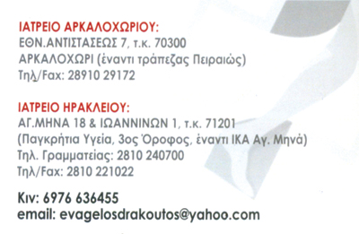 2ο ιατρείο: Αγ. Μηνά 18 και Ιωαννίνων 1 3ος όροφος, Έναντι ΙΚΑ ΗράκλειοΔέχεται 17:30 -20:30 εκτός Τετάρτης ΑπογεύματοςΑρκαλοχώρι 09:00-14:00 καθημερινά Χειρ. Ορθοπεδικός Παίδων και Ενηλίκων, Παθήσεις σπονδυλικής στήλης,Παθήσεις άνω άκρων και άκρων χειρός