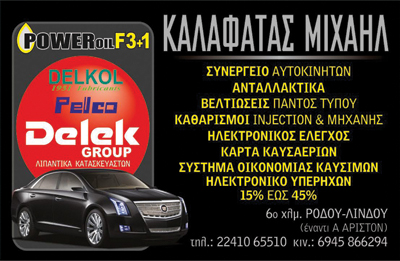 Καλαφατάς Μιχάλης, Μιχαήλ Καλαφατάς, Συνεργείο αυτοκινήτων,Power Oil F3+1, Βελτιώσεις, αύξηση ιπποδύναμης 15% έως 35%, Οικονομία καυσίμων 15% έως 50%, ηλεκτρονικών υπερήχων, υγραερίου-υδρογόνου, τηλ 2241065510,6945866294, Βελτιώσεις θωρακίσεις μηχανής σασμάν, Σβήσιμο λαθών μνήμης εγκεφάλου. ηλεκτρονικός έλεγχος, ευθυγραμμίσεις, Αντιτριβικά, Λιπαντικά Ι.Χ, Μοτό, Σκάφη, Αγροτικά, Φορτηγά, PowerOil F3+1, PELCO, DELKOL, Καθαρισμός injection καταλύτη, Ρόδος, Μηχανικός βελτιωτής