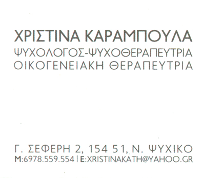 Είδος θεραπείας: Ατομική - Ζευγαριού - Οικογενειακή -Ομαδική Θεραπεία Ψυχοθεραπευτική Μέθοδος:Συνθετική θεραπεία ή Συστημική θεραπεία Διεξαγωγή συνεδρίας στο γραφείο ή internet - skype