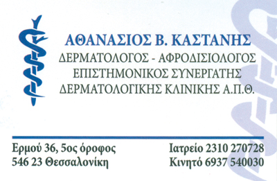 Επιστ. ΣυνεργάτηςΔερματολογικής κλινικής Α.Π.Θ.Δέχεται καθημερινά 17:00 - 21:00 με ραντεβού.