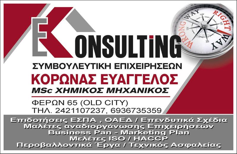 Η EK CONSULTING – ΚΟΡΩΝΑΣ ΕΥΑΓΓΕΛΟΣ ιδρύθηκε το 1997 με σκοπό την παροχή εξειδικευμένων συμβουλευτικών υπηρεσιών για: