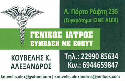 Ο γενικός ιατρός Κουβέλης Αλέξανδρος είναι συμβεβλημμένος με ΕΟΠΥΥ,αναλαμβάνει νεφρολογικές παθήσεις, προληπτική ιατρική, γενικός οικογενειακός γιατρός,πιστοποιητικά υγείας, συμβεβλημμένος γιατρός για δίπλωμα οδήγησης κ.α.
