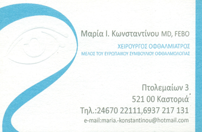 Διαθλαστικές επεμβάσειςΚαταρράκτηςΟπτικά πεδίαLaserΦακοί επαφήςΚαθημερινά Δευτέρα - Τρίτη - Πέμπτη - Παρασκευή, απόγευμα Τετάρτης με ραντεβού.