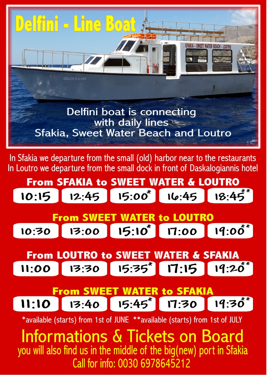 Θαλάσσιες μεταφορές και εκδρομές. Υπάρχουν καθημερινά δρομολόγια από και προς Σφακιά, Λουτρό, Αγία Ρούμελη, Φοίνικα, Μαρμαρά και Γλυκά Νερά. Μπορούμε επίσης να εξυπηρετήσουμε κόσμο και μετά το κλείσιμο της γραμμής.